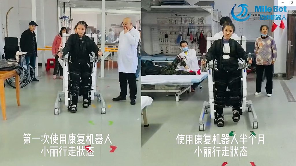 (使用康復機器人一周后,攙扶拐杖下,小麗可以慢慢地穩步走動)